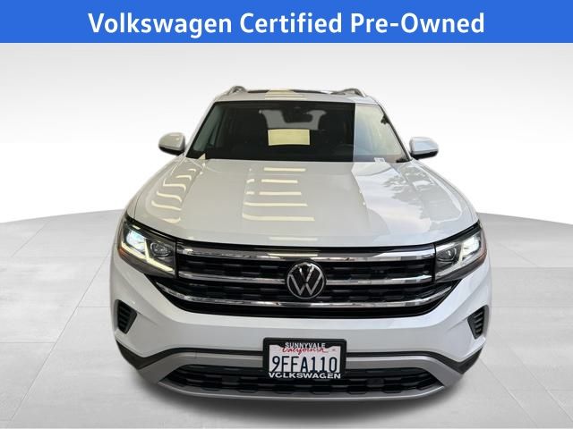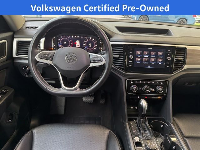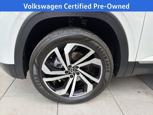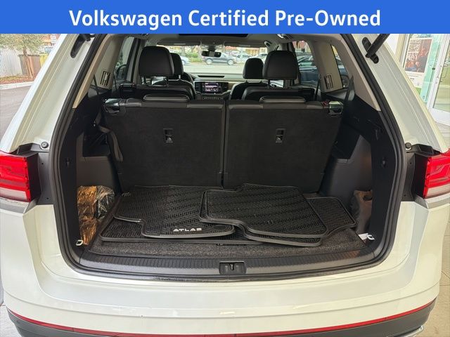Volkswagen Certified, Moonroof/Sunroof, 2nd-Row Dual Captain's Chairs, 3.60 Axle Ratio, 4-Wheel Disc Brakes, 6 Speakers, ABS brakes, Air Conditioning, Alloy wheels, AM/FM radio: SiriusXM with 360L, Auto High-beam Headlights, Auto-dimming Rear-View mirror, Automatic temperature control, Brake assist, Bumpers: body-color, Compass, Delay-off headlights, Driver door bin, Driver vanity mirror, Dual front impact airbags, Dual front side impact airbags, Electronic Stability Control, Emergency communication system: VW Car-Net Safe & Secure 5-year, Exterior Parking Camera Rear, Four wheel independent suspension, Front anti-roll bar, Front Bucket Seats, Front Center Armrest, Front dual zone A/C, Front fog lights, Front reading lights, Fully automatic headlights, Heated Comfort Front Bucket Seats, Heated door mirrors, Heated front seats, Heated steering wheel, Illuminated entry, Leather Shift Knob, Low tire pressure warning, Memory seat, Occupant sensing airbag, Outside temperature display, Overhead airbag, Overhead console, Panic alarm, Passenger door bin, Passenger vanity mirror, Perforated V-Tex Leatherette Seating Surfaces, Power door mirrors, Power driver seat, Power Liftgate, Power moonroof: Panoramic, Power passenger seat, Power steering, Power windows, Radio data system, Radio: MIB3 Discover Media w/8" Touchscreen Nav, Rain sensing wipers, Rear air conditioning, Rear anti-roll bar, Rear reading lights, Rear seat center armrest, Rear window defroster, Rear window wiper, Remote keyless entry, Security system, Speed control, Speed-sensing steering, Split folding rear seat, Spoiler, Standard Suspension, Steering wheel mounted audio controls, Tachometer, Telescoping steering wheel, Tilt steering wheel, Traction control, Trailer Hitch Extras, Trip computer, Turn signal indicator mirrors, Variably intermittent wipers, Wheels: 20" x 8J 5-Spoke 2-Tone Machined Alloy. Certified. White 2023 Volkswagen Atlas SEL AWD 8-Speed Automatic with Tiptronic 3.6L V6