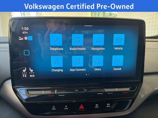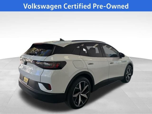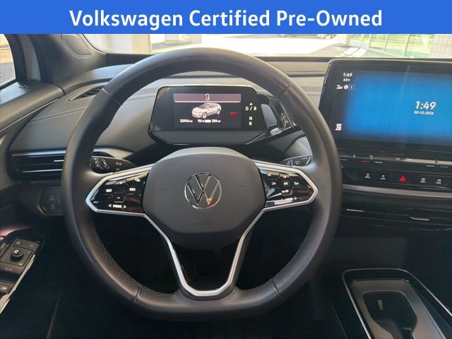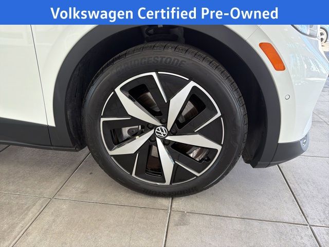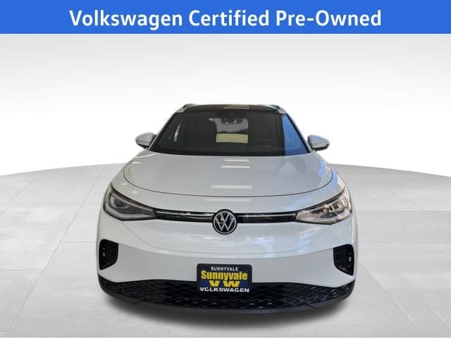 Navigation, Volkswagen Certified, Moonroof/Sunroof, 4 Wheel Independent Suspension, 4.39 Axle Ratio, 7 Speakers, ABS brakes, Air Conditioning, Alloy wheels, Auto High-beam Headlights, Auto-dimming Rear-View mirror, Automatic temperature control, Brake assist, Bumpers: body-color, Delay-off headlights, Driver door bin, Driver vanity mirror, Driver's Seat Mounted Armrest, Dual front impact airbags, Dual front side impact airbags, Electronic Stability Control, Emergency communication system: VW Car-Net Safe & Secure 5-year, Exterior Parking Camera Rear, Four wheel independent suspension, Front anti-roll bar, Front Bucket Seats, Front dual zone A/C, Front fog lights, Front reading lights, Fully automatic headlights, Heated door mirrors, Heated Front Seats, Heated front seats, Heated steering wheel, Illuminated entry, Low tire pressure warning, Memory seat, Navigation System, Occupant sensing airbag, Outside temperature display, Overhead airbag, Overhead console, Panic alarm, Passenger door bin, Passenger seat mounted armrest, Passenger vanity mirror, Perforated V-Tex Leatherette Seating Surfaces, Power door mirrors, Power driver seat, Power Liftgate, Power passenger seat, Power steering, Power windows, Radio data system, Radio: Discover Pro Max w/12" Touchscreen Nav, Rain sensing wipers, Rear anti-roll bar, Rear reading lights, Rear seat center armrest, Rear window defroster, Rear window wiper, Remote keyless entry, Speed control, Speed-sensing steering, Split folding rear seat, Spoiler, Steering wheel mounted audio controls, Telescoping steering wheel, Tilt steering wheel, Traction control, Trip computer, Turn signal indicator mirrors, Variably intermittent wipers, Wheels: 20" 5-Spoke 2-Tone Machined Alloy. Certified. Opal White Pearl 2023 Volkswagen ID.4 Pro S RWD Single-Speed Automatic Electric Motor