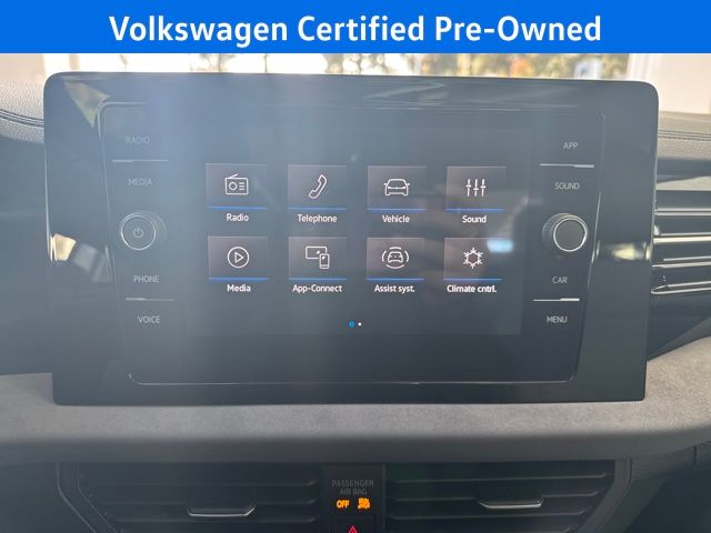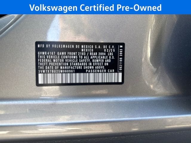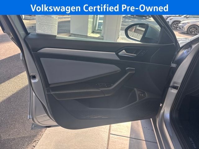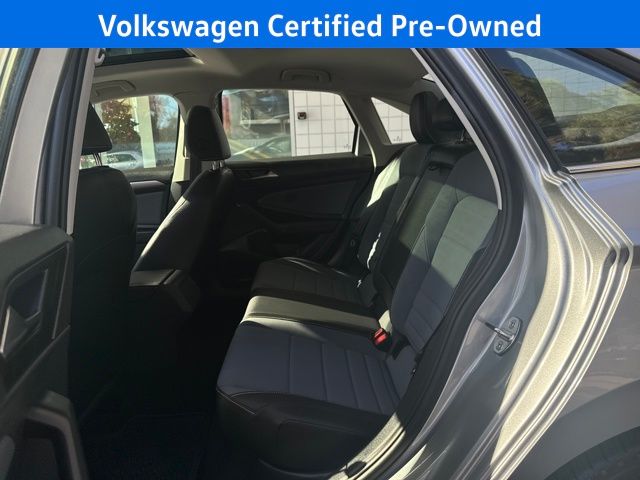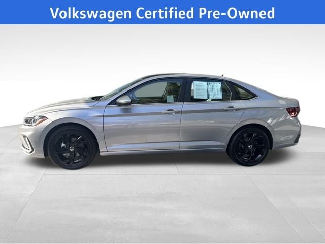 2025 Volkswagen Jetta 1.5T SE in Silver with Grigio/Titan Black Cloth, Volkswagen Certified, Moonroof/Sunroof, Grigio/Titan Black w/CloudTex & V-Tex Leatherette Seat Trim, 4-Wheel Disc Brakes, 6 Speakers, ABS brakes, Active Blind Spot Monitor, Active Cruise Control, Air Conditioning, Alloy wheels, AM/FM radio: SiriusXM with 360L, Automatic temperature control, Black Wheel Package, Brake assist, CloudTex & V-Tex Leatherette Seat Trim, Dual front impact airbags, Dual front side impact airbags, Electronic Stability Control, Exterior Parking Camera Rear, Front anti-roll bar, Front Bucket Seats, Front Center Armrest, Front dual zone A/C, Front wheel independent suspension, Fully automatic headlights, Heated door mirrors, Heated Front Seats, Heated front seats, Low tire pressure warning, Occupant sensing airbag, Overhead airbag, Passenger door bin, Passenger vanity mirror, Power door mirrors, Power driver seat, Power steering, Power Tilting & Sliding Sunroof, Power windows, Radio data system, Radio: MIB3 Composition Media w/8" Touchscreen, Rain sensing wipers, Rear reading lights, Rear seat center armrest, Rear window defroster, Remote keyless entry, Speed-sensing steering, Steering wheel mounted audio controls, Sunroof Package, Tachometer, Telescoping steering wheel, Tilt steering wheel, Trip computer, Variably intermittent wipers, Wheels: 18" Dark Graphite Painted Alloy. Certified. Silver 2025 Volkswagen Jetta 1.5T SE FWD 8-Speed Automatic with Tiptronic 1.5L I-4 DI DOHC Turbocharged