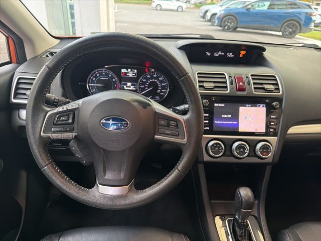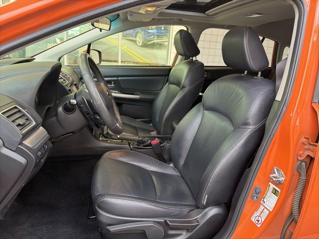 Moonroof/Sunroof, 17" x 7.0J Aluminum Alloy Wheels, 3.70 Axle Ratio, 4-Wheel Disc Brakes, 6 Speakers, ABS brakes, Air Conditioning, Alloy wheels, AM/FM radio: SiriusXM, Automatic temperature control, Brake assist, Bumpers: body-color, CD player, Driver door bin, Driver vanity mirror, Dual front impact airbags, Dual front side impact airbags, Electronic Stability Control, Exterior Parking Camera Rear, Four wheel independent suspension, Front anti-roll bar, Front Bucket Seats, Front Center Armrest, Front fog lights, Front reading lights, Fully automatic headlights, Heated door mirrors, Heated Front Bucket Seats, Heated front seats, Illuminated entry, Knee airbag, Lane Departure Warning System, Leather Shift Knob, Leather steering wheel, Low tire pressure warning, MP3 decoder, Occupant sensing airbag, Outside temperature display, Overhead airbag, Panic alarm, Passenger door bin, Passenger vanity mirror, Perforated Leather-Trimmed Upholstery, Power door mirrors, Power steering, Power windows, Radio data system, Radio: Subaru Starlink 7.0" Multimedia Plus System, Rear anti-roll bar, Rear seat center armrest, Rear Vision Camera, Rear window defroster, Rear window wiper, Remote keyless entry, Roof rack: rails only, Security system, Speed control, Speed-sensing steering, Split folding rear seat, Spoiler, Steering wheel mounted audio controls, Tachometer, Telescoping steering wheel, Tilt steering wheel, Traction control, Trip computer, Turn signal indicator mirrors, Variably intermittent wipers. Orange 2015 Subaru XV Crosstrek 2.0i Limited AWD Lineartronic CVT 2.0L 16V DOHC