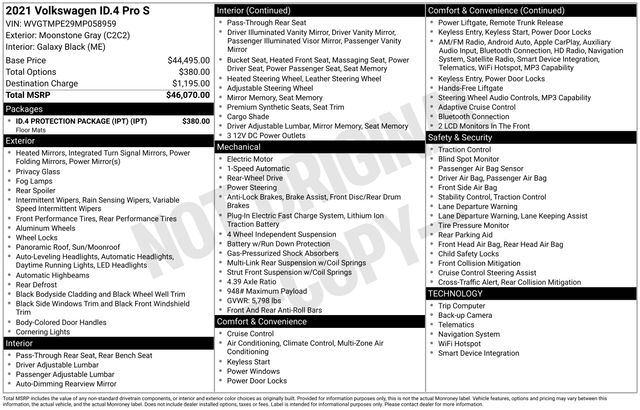 2021 Volkswagen ID.4 Pro S in Gray with Galaxy Black Artificial Leather, Navigation, Volkswagen Certified, Moonroof/Sunroof, 4 Wheel Independent Suspension, 4.39 Axle Ratio, 7 Speakers, ABS brakes, Active Cruise Control, Air Conditioning, Alloy wheels, Auto High-beam Headlights, Automatic temperature control, Brake assist, Bumpers: body-color, Dual front impact airbags, Dual front side impact airbags, Electronic Stability Control, Exterior Parking Camera Rear, Four wheel independent suspension, Front anti-roll bar, Front Bucket Seats, Front dual zone A/C, Front reading lights, Fully automatic headlights, Heated door mirrors, Heated Front Seats, Heated front seats, Low tire pressure warning, Memory seat, Navigation System, Occupant sensing airbag, Overhead airbag, Perforated V-Tex Leatherette Seating Surfaces, Power door mirrors, Power driver seat, Power Liftgate, Power passenger seat, Power steering, Power windows, Radio data system, Radio: Discover Pro Max w/12" Touchscreen Nav, Rain sensing wipers, Rear anti-roll bar, Rear reading lights, Rear seat center armrest, Rear window defroster, Rear window wiper, Remote keyless entry, Split folding rear seat, Steering wheel mounted audio controls, Telescoping steering wheel, Tilt steering wheel, Traction control, Trip computer, Variably intermittent wipers, Wheels: 19" 5-Spoke 2-Tone Machined Alloy. Certified. Gray 2021 Volkswagen ID.4 Pro S RWD Single-Speed Automatic Electric Motor